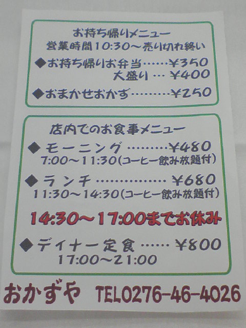 前はテイクアウト専門のお弁当?その名のとうりのおかずやさんで、最近少し中を改築して、テイクアウト他、店内で、モーニング・ランチ・ディナーが出来るようになったみたいです。